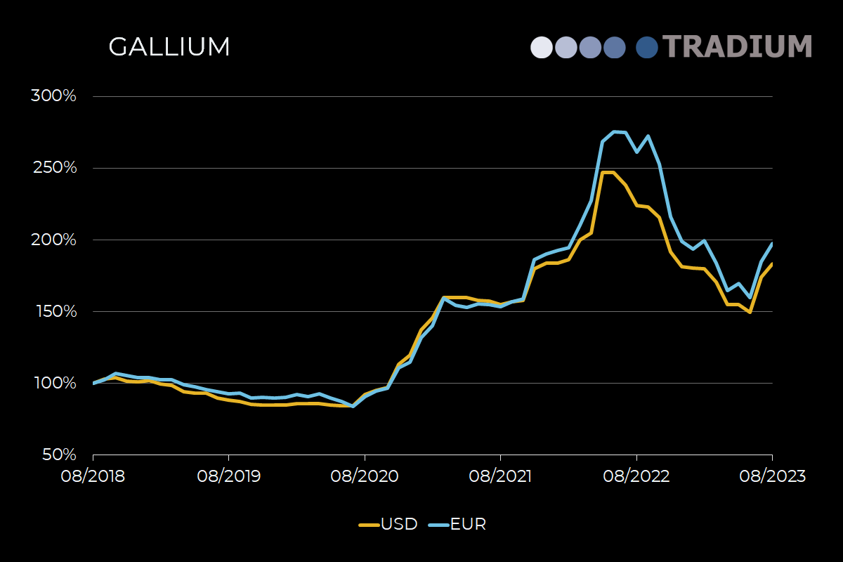At today’s price of $654.40 per kg, gallium changed +2.12% since Jan 1st 2023. It is up +54.81% compared to its price of $422.70 per kg on Jan 1st 2021 and increased +119.45% since Jan 1st 2020. If we go back to Jan 1st 2018, when the cost of gallium was $274.37 per kg, then the increase is +138.51%.